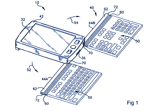The most distinctive feature of a PDA is its touch-sensitive screen. In contrast to many portable computers, a PDA (usually) does not not contain a traditional, large "QWERTY" keyboard (which would make it less portable). Instead, you use a stylus to tap on-screen for entering and accessing data. Although stylus handwriting recognition doesn't take long to learn, it has been one of the biggest issues many people have with PDAs. To overcome the limitations of stylus input and to remain fully portable, HP's engineers came up with a new - patented - idea: simply attach a "QWERTY" keyboard to your handheld!The keyboard, which has a size and shape similar to the PDA, is divided into two separated sections, which are pivotally connected to the body and rotationally move between a closed and open positions. In a closed position, two keyboard sections are stacked on top of the body and can function as a protection cover. In the open position, they move together into a full alphanumeric keyboard which can then be used as an alternative to stylus input. For a better illustration, have a look at the five attached images from HP: Figure 1 depicts a perspective view of a PDA with the keyboard in an extended open position; Figure 2 depicts a perspective view of a PDA with the keyboard in an open position; Figure 3 depicts a top view of a PDA with the keyboard in a closed position; Figure 4 depicts a bottom view of a PDA with the keyboard in a closed position; Figure 5 decpits a side view of a PDA with the keyboard in a closed position. |
