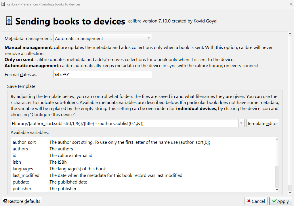 You have to connect your Kobo to Calibre twice to get the series info transferred - first, send the books over, eject, let your Kobo process them and then connect again. After ejecting the second time, you should have your series on your Kobo. Edit: forgot to add that the metadata management should be set to Automatic in Calibre. Last edited by Sirtel; 05-02-2024 at 05:38 AM. |