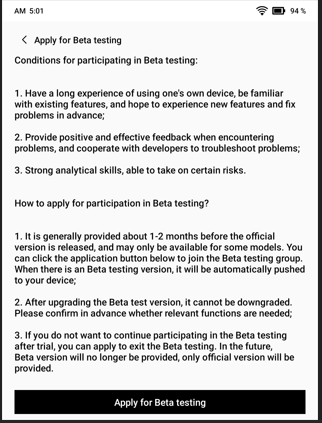 New update 3.5.3 support Dark Mode & New GUI(Graphics Interface) for Boox Onyx devices is out ! Good day ladies and gentlemen, check all your devices as there is a new update available that will bring a feature I've been waiting for a long time and that is "DARK MOD & NEW GUI"! I personally like the new GUI improvements (graphical interface) much more than the previous ones. ( Tested with BOOX Onyx Leaf 2 ) These are the highlights of the new firmware update • New UI: Minimalist Elegance, Maximum Efficiency • Annotate & Share: FreeMark and BOOXDrop Screen Mirroring • Read & Take Notes: Dark Mode, Smarter Image Edit and OCR - New system UI look - Added globalnAI assistant - Updated Android security Patch NeoReader - The flow document suport Dark Mode - Optimized document sync proces And more .. In addition to the aforementioned upgrades, an AI assistant is now available in the Naviball and Control Center, If you haven't received it yet, please wait a bit longer or check for updates in Settings LEAR MORE HERE : https://shop.boox.com/blogs/news/boox-firmware-v3-5-3 INFO: I also n oticed that if you look deeper into the settings, it is possible to directly sign up to receive the Beta version, which can be interesting for users who like to test for the first time, or are impatiently waiting for some small pre-fixes. Last edited by Michal Jancik; 07-06-2024 at 12:21 AM. |