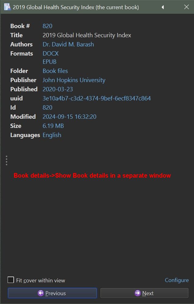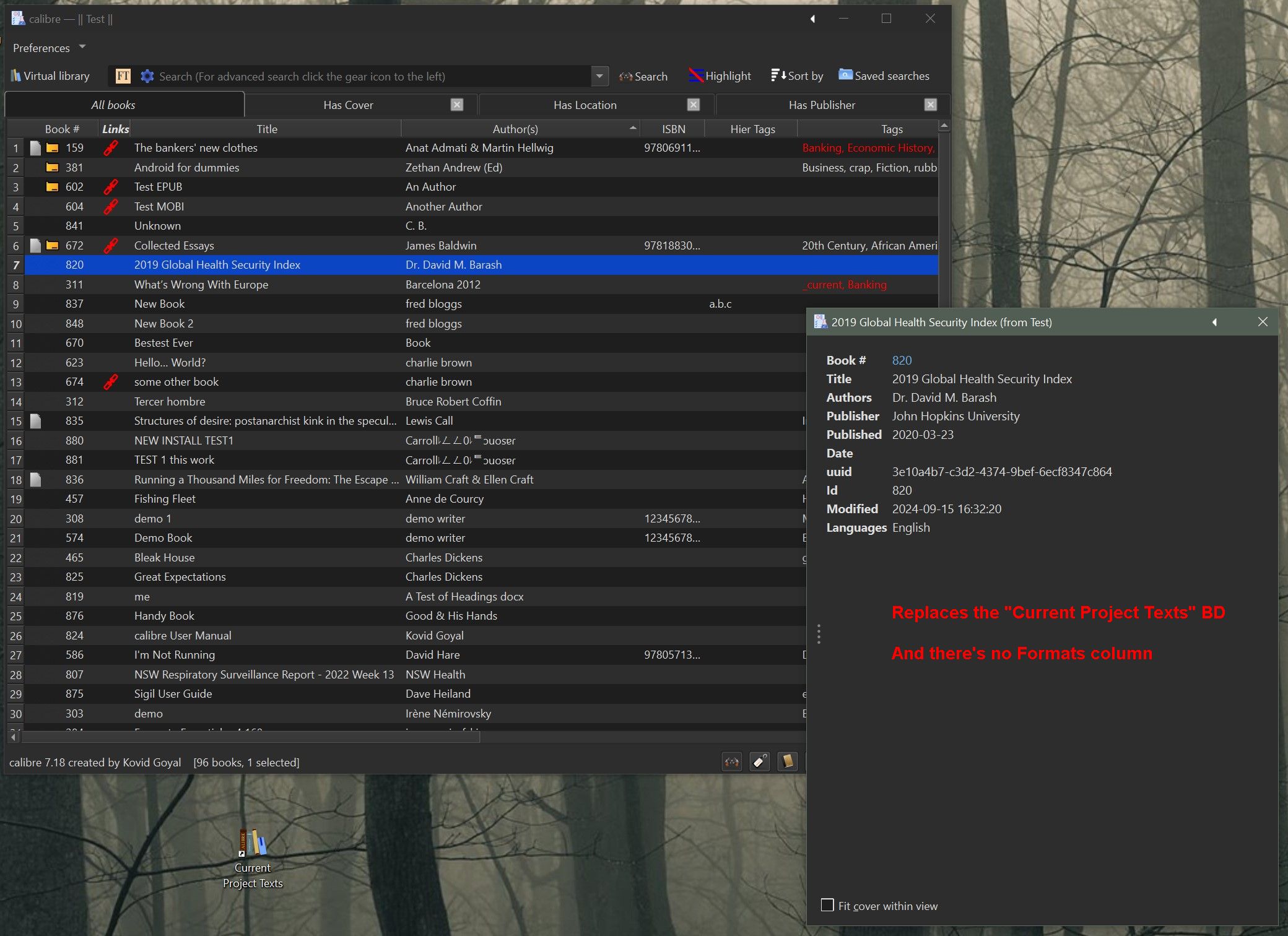 I'm only interested in nominating one book per library Sorting would not move it from top of list The book would always be shown irrespective of search expression, virtual library etc. What would I use it for… to store a list of calibre://book-details URLs to books I want to have at my fingertips. Any suggestions ? Added: Maybe with a locked and docked Quickview… BR Last edited by BetterRed; 09-15-2024 at 01:25 AM. |
