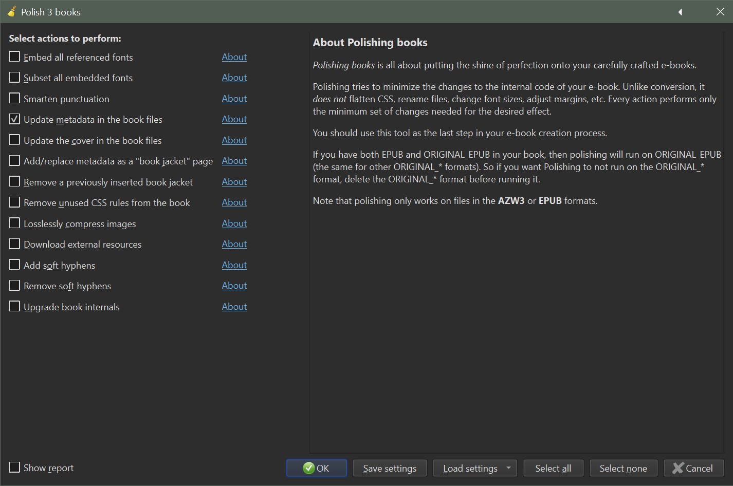 Select all books in the library manager (Ctrl+A), press 'P' and the Polish books dialogue will pop: