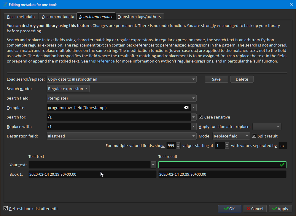 There are approximately 600 books in which I have set a date. I would like to copy/move those dates to a new column. If I have to do that one by one, I'll lose a few days. They are now in the "Date" column, but with every change the change date is set there and my date is overwritten. Maybe you can change that so that there is no longer a date when changes are made. |