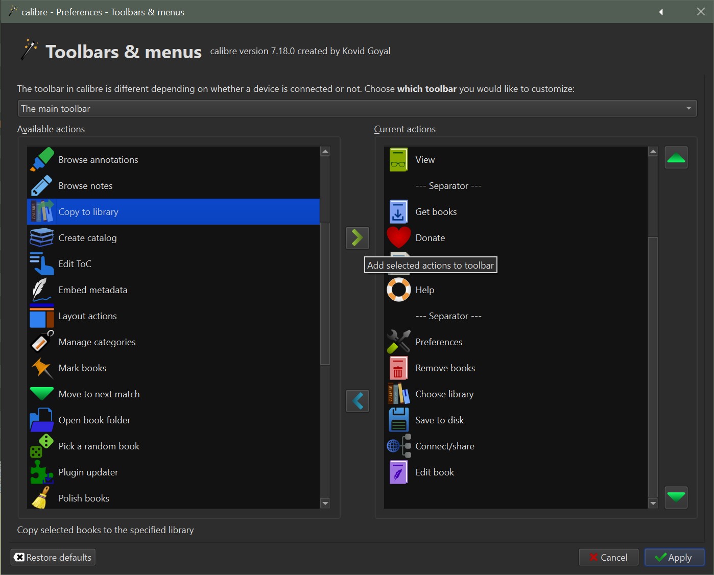 I see instructions online a few places that say to select books in Library 2, right-click and "copy to ...", but this command does not seem to appear on currrent version. Thanks |