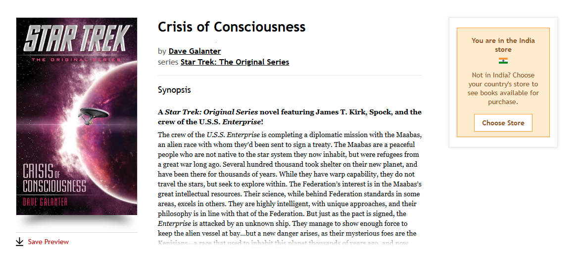 Oddly, I can't find the Star Trek book you are looking for on www.kobo.com/in/en. The only Dave Galanter book they seem to have is an audio book. |