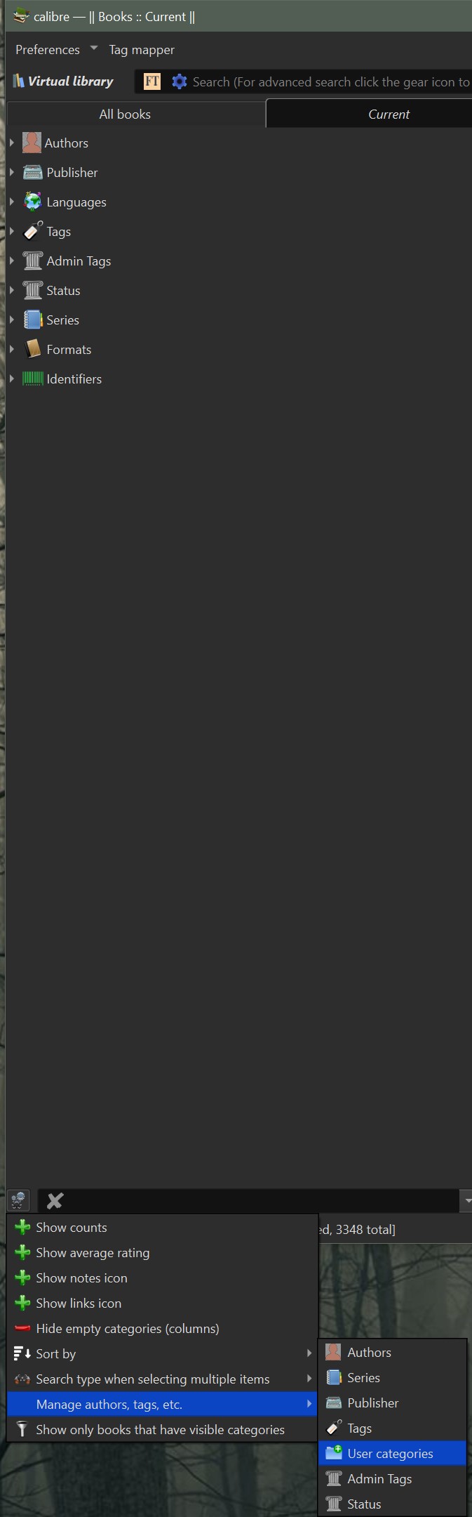 I want to populate my shelf column based on the tags that get pulled from any download metadata. I use the tags column to populate the subtitle on my kobo, so I want it separate from my collections. Anyone have any ideas? So some example tag column values: Book 1: Fantasy, Humor, Adult Book 2: High Fantasy Book 3: Comedy, First Love, Young Adult Book 4: Fairy Tales; Folk Tales; Legends & Mythology; Legends & Mythology Example collection values: Book 1: Fantasy, Comedy Book 2: Fantasy Book 3: Comedy, Romance Book 2: Fantasy Last edited by 1ily; 10-16-2024 at 06:53 PM. |