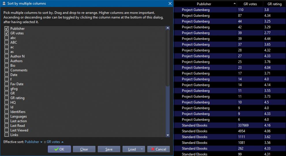 ![]() Might be me but sometimes when I look at it, it feels like the arrows are inverted. In the preset illustrated below, I wanted to sort by Publisher (Z to A - descending), then by GR votes (descending, from highest voted to least voted) |