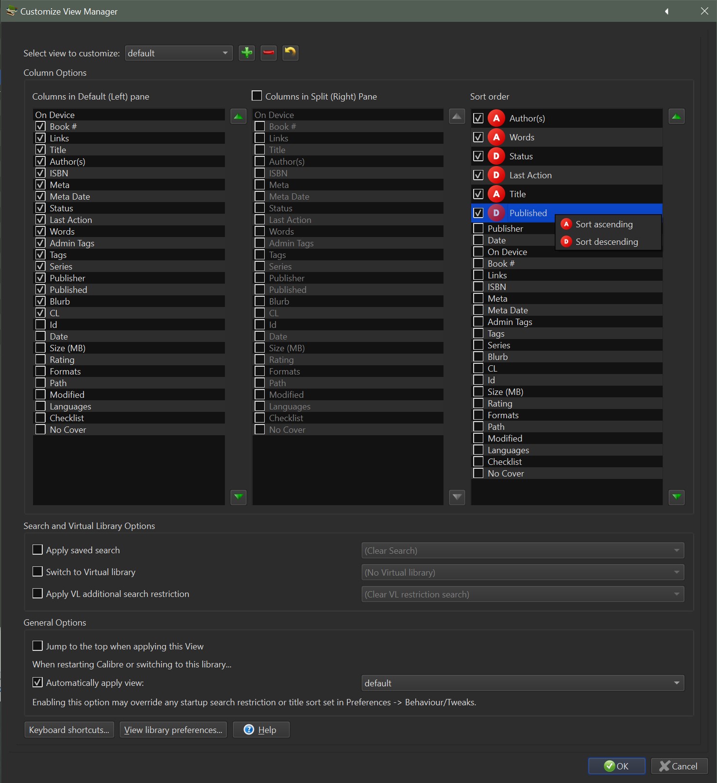 ID: sort_columns_at_startup Provide a set of columns to be sorted on when calibre starts. The argument is None if saved sort history is to be used otherwise it is a list of column,order pairs. Column is the lookup/search name, found using the tooltip for the column Order is 0 for ascending, 1 for descending. For example, set it to [('authors',0),('title',0)] to sort by title within authors. ![]() I think you can only drag if a tick is next to it. Down below is the effective sort. clicking the arrowhead the changes the direction |