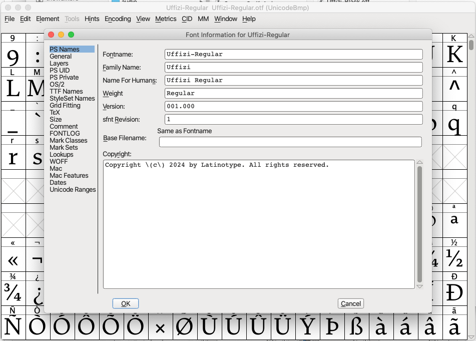 And here is the info for the Uffizi font. I think the issues are similar to the first font I posted, but I can't figure out if there is a specific name field/value that I need to change in FontForge to make it work properly.