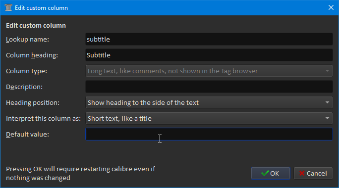 But there's something that bothers me about it. If I press F2 on the cell I don't get a dialogue box to enter/edit the value, instead I get a very short inline edit box. I understand why, the long text editor only pops if the column is defined as having HTML mark up… which I don't want in a subtitle. So I can either enter/edit in the semi-darkness or use MDE and cut and paste between the Title (which more often than not contains the subtitle) and Subtitle fields which in my case are on different Tab panels. Such is life. BR |
