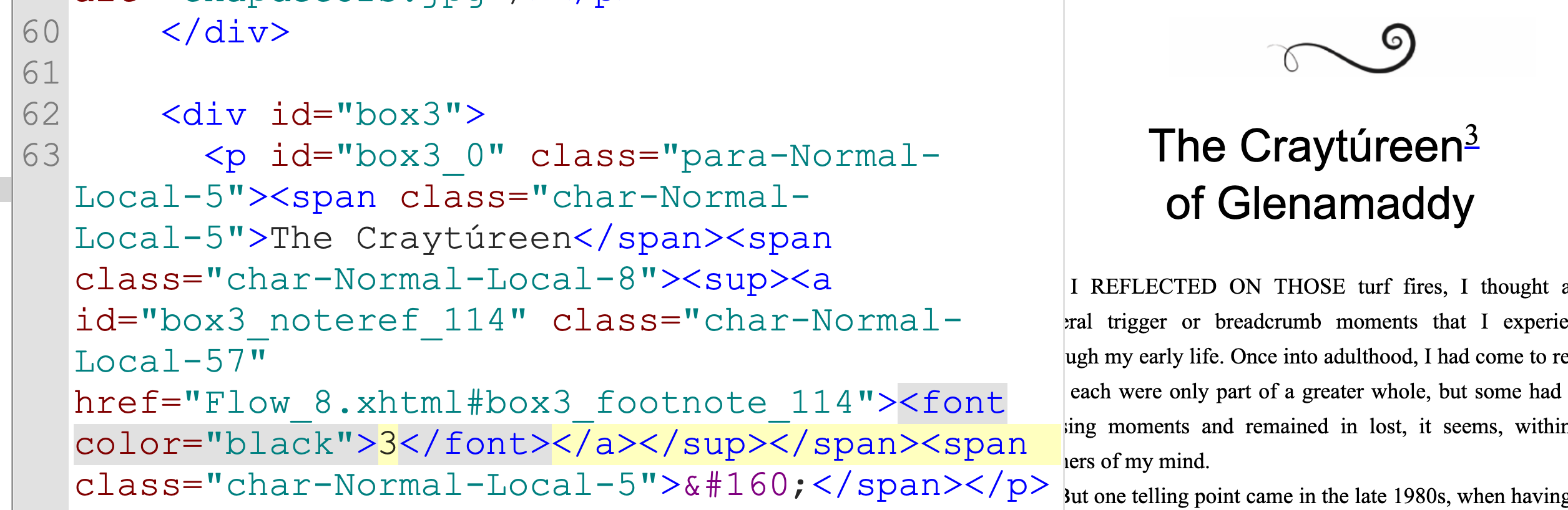 ERROR(RSC-005): /OEBPS/Flow_8.xhtml(63,256): Error while parsing file: element "font" not allowed anywhere; expected the element end-tag, text or element "a", "abbr", "acronym", "applet", "b", "bdo", "big", "br", "cite", "code", "del", "dfn", "em", "i", "iframe", "img", "ins", "kbd", "map", "noscript", "ns:svg", "object", "q", "samp", "script", "small", "span", "strong", "sub", "sup", "tt" or "var" (with xmlns:ns="http://www.w3.org/2000/svg") THIS IS CURRENTLY HOW THE CODE STANDS: CAN I REPLACE The <font color> tag with something else? this is the only superscript I want to make black. all others are fine. <p id="box3_0" class="para-Normal-Local-5"><span class="char-Normal-Local-5">The Craytúreen</span><span class="char-Normal-Local-8"><sup><a id="box3_noteref_114" class="char-Normal-Local-57" href="Flow_8.xhtml#box3_footnote_114"><font color="black">3</font></a></sup></span><span class="char-Normal-Local-5"> </span></p> |