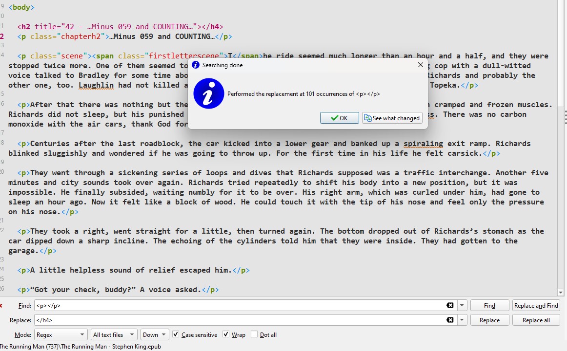 Bug description: calibre version 7.22.0 macOS 13.7.1 (22H221) Intel iMac 3.6 GHz 10-Core Intel Core i9 Certain search strings won’t show correct results over multiple files. The specific failure I am having today is searching for "<p></p>" to be replaced with "</h4>". I have 40 chapters for my book, and every chapter had the <p></p> needing to be replaced with </h4>. I could search and replace across all files for things like </h4> for </h4>, but the <p></p> for </h4> would only successfully replace on one HTML file at a time. This made me have to open each file in succession in order to accomplish the desired search and replace operation. I have other examples, but I will defer listing them for now. This is an easy string to try the problem with and my other examples have similar results. I used "Normal" and "Regex" as my search and replace mode to see if a different search mode would show different results. For all tries there was no change in returned results. Help! |