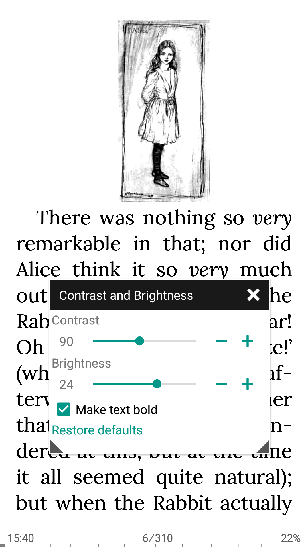 2. Sometimes it skipped parts of the text. Especially towards the end of chapters. The text should have been on the top of one page, but didn't show. Very annoying when the end of a sentence or a paragraph on the previous page is never shown. Or the start of one on the current. The only(?) way to fix that was to change the size of the font so the "page breaks" changed. I assume it is some weird rounding error to do with where to place page breaks.