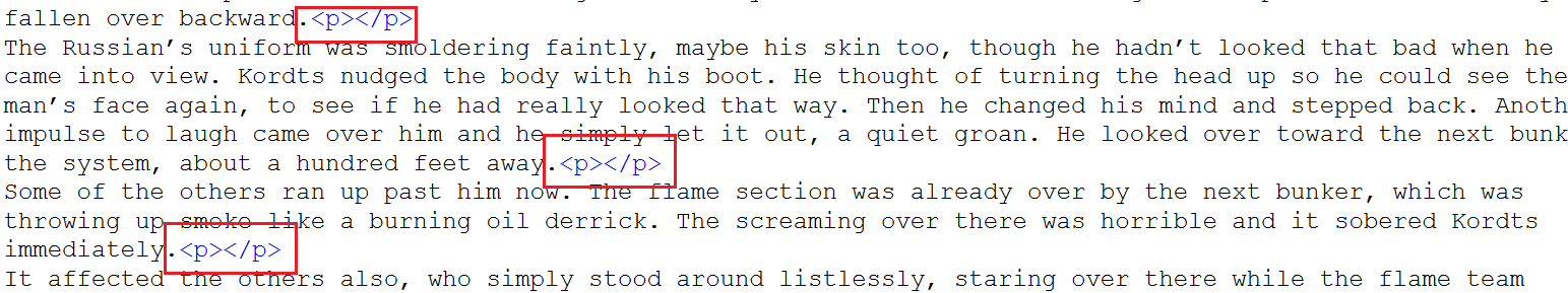 Hi again, and thanks so much for your comments! There actually isn't a <p> tag at the beginning of each paragraph, only a <p></p> at the end of each, which is why I'm surmising that Calibre can't locate the beginning of each paragraph. Screenshot attached.