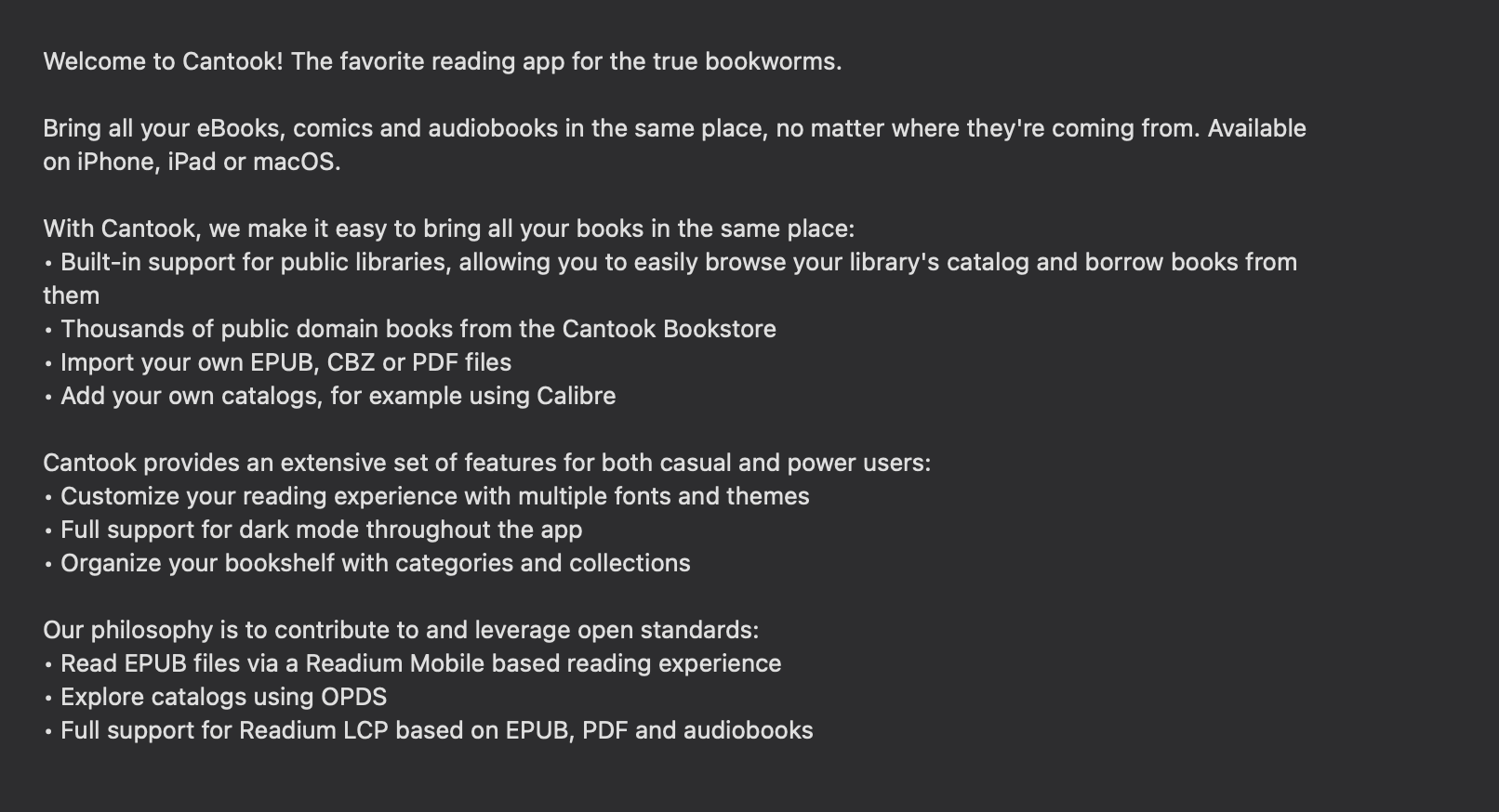 Cantook seems to to be building a platform based on open source Readium. The apps (see capture) let you read ePub, PDF, audiobooks (just as with Thorium Reader). The apps support OPDS and 'public libraries'. So it seems this is one 'library' that you can access with the apps and probably web browser at feedbooks.com. I don't see any provision for syncing between app instances. It probably does not cost much to make some set of titles available for borrowing like any public library, especially since it seems likely nearly everything will have a wait list, assuming that feature even exists (59 day borrowing, some only a single copy). Especially if the purpose is to eventually start some subscription service later, or just to have some traffic while they build out infrastructure. Right now it just seems to be a placeholder. Can you set up app for borrowing from Overdrive or any other library system? or is that just aspirational? I might check it out more next week but am too busy now. Last edited by tomsem; 02-28-2025 at 04:04 AM. |