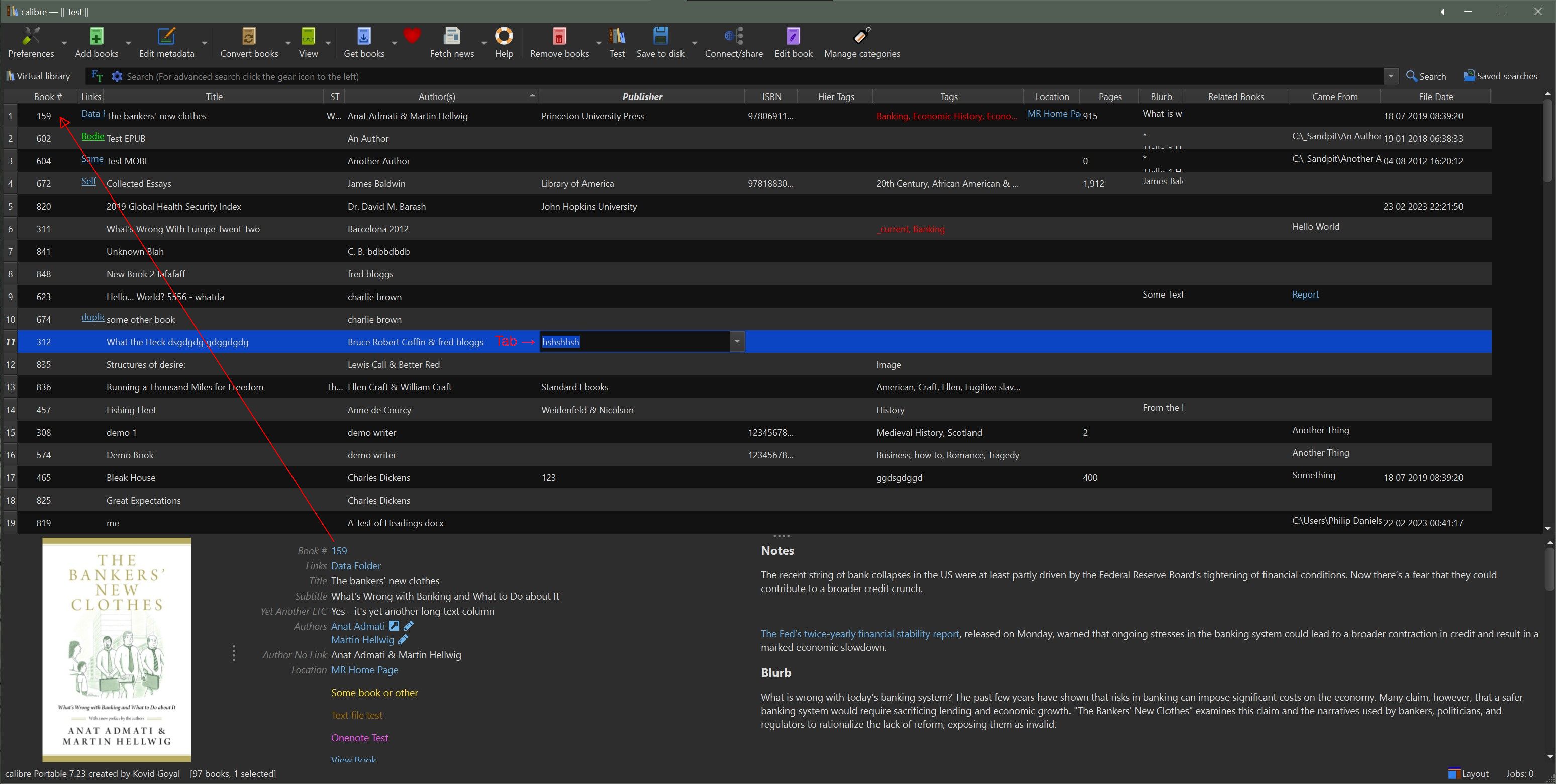 Basically if the cells of the Nth book in the list are being edited when Tab is pressed to go into next cell the focus shifts to the first book in the list and it sometimes gives focus to a seemingly random cell for that book… on one occasion it popped the long text edit for my Location column. And, if the DOCX in that first book is open in Word the "File in use" error handler kicks in. I tested Windows portable versions 7.15, 7.16, 7.17, 7.18, 7.21.101 and 7.23 - the first two were okay, the rest have the problem. I'll raise a bug report. Done ==>> https://bugs.launchpad.net/calibre/+bug/2092643 BR Last edited by BetterRed; 12-28-2024 at 11:24 PM. Reason: add screen shot |