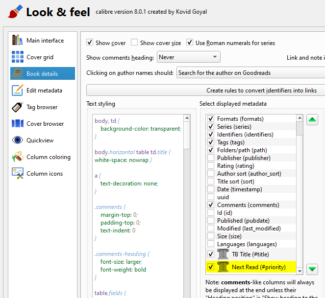 The first couple of images are what my settings look like after adding the new column. The next couple show that I don't see my new field in either the main window or on the metadata for a book. However, I also came across something else that shows my new column, but I don't know what it is.