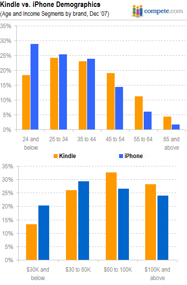 Also, in comparison to the Apple iPod, Seeking Alpha discovered that the Kindle attracts a more mature crowd ("30-something business professionals") with higher income. Quote: