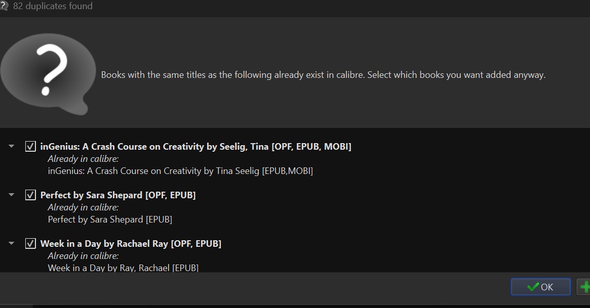 1) You saved my library. I now have 3175 books (which should be either all or most of them). So thanks a lot. 2) For some reason, while importing the library, it detected 84 books already in Calibre (which it shouldn't have, as the library was clean and these books were added into an empty library). SO, I don't know what happened there. No worries, though, I will clean it again if necessary. Just wanted to let you know. For example, it detected different formats (one of them being OPF), and some of the books already in Calibre had a format name [none], which is weird. Again, no worries, I will clean the library. Aside from this, only other caveat is that the library now is in a different order and most books appear as added today. But I got my whole library back, and that's the best. Thanks a lot, mate