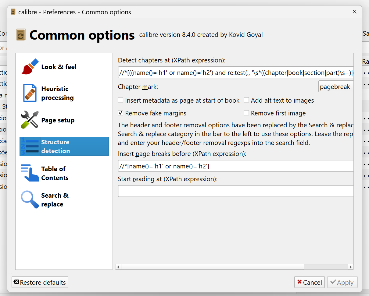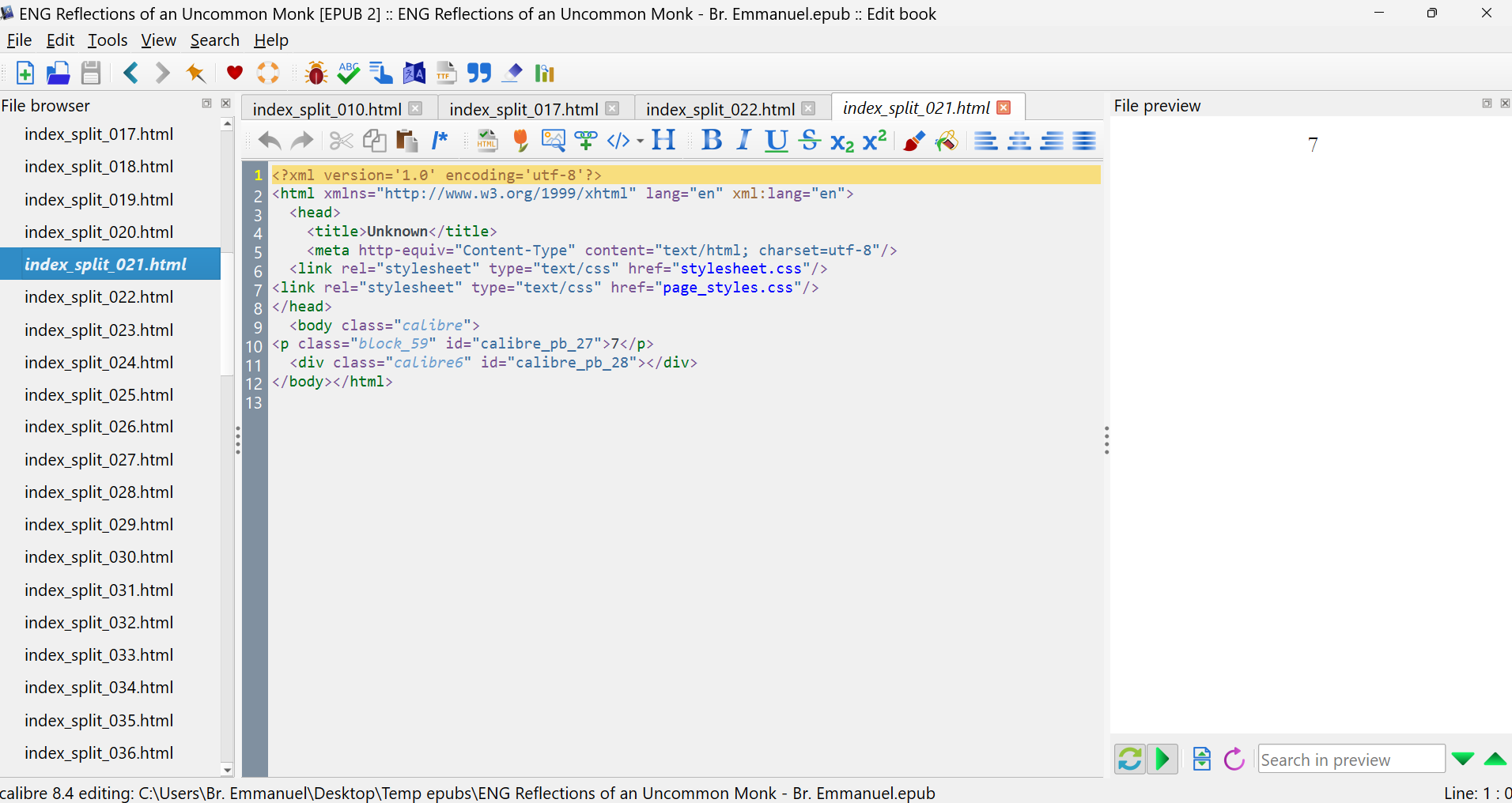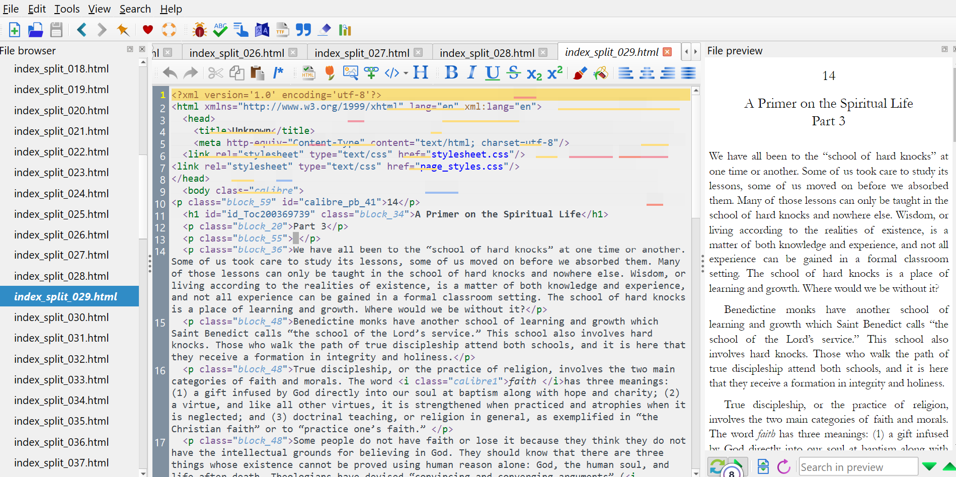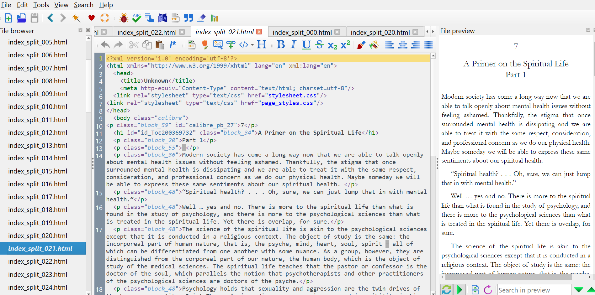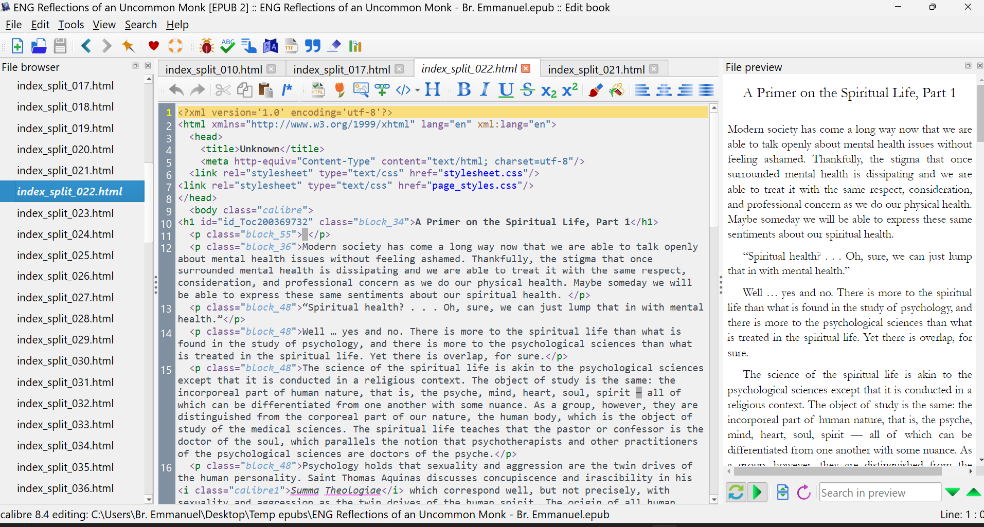 Forgive me, but I am new and unsure of how to use this forum. I am a self-publishing author and am creating an ebook using Calibre. I want to have my chapter headings such that the chapter number(s) appears above the chapter title(s), both of which are centered. This works out on all of my chapters except seven of them, and according to D2D validation tool, there are no errors. The seven chapters that do not work out all have the chapter title: "A Primer on the Spiritual Life, Part...", and with each of these seven chapters, Calibre inserts a page break between the chapter number and "A Primer on the Spiritual Life, Part..." Can you help to remedy this, please? I am using MS Word and uploading it into Calibre. Attached is the first of these chapter titles in the original Word document (Calibre - Forum 1). Also attached is the code in Calibre (Calibre - Forum 1 and 2). Please help if you can. Bremman Last edited by Bremman; 06-10-2025 at 02:34 PM. |