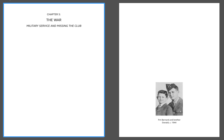 Here is code from beginning of page through part of first paragraph: <?xml version="1.0" encoding="utf-8"?> <!DOCTYPE html> <html xmlns="http://www.w3.org/1999/xhtml" lang="en-US" xml:lang="en-US" xmlns:epub="http://www.idpf.org/2007/ops"> <head> <title>CHAPTER 5:</title> <link href="css/idGeneratedStyles.css" rel="stylesheet" type="text/css"/> </head> <body id="Boys_From_The_Bronx_ePub_2nd-v6-12"> <div class="_idGenObjectStyleOverride-1"> <h2 class="Chapter--" title="Chapter 5: The War"><a id="_idTextAnchor013" target="_blank"></a><span id="page42" role="doc-pagebreak" aria-label="31" epub:type="pagebreak"></span>CHAPTER 5:</h2> <h1 class="Chapter-Title sigil_not_in_toc"><a id="_idTextAnchor014" target="_blank"></a>THE WAR</h1> <h3 class="Chapter-subtitle sigil_not_in_toc"><a id="_idTextAnchor015" target="_blank"></a>Military Service and Missing the Club</h3> <div class="_idGenObjectLayout-1"> <div id="_idContainer021" class="_idGenWritingDirection-1"> <div id="_idContainer019"> <img class="_idGenObjectAttribute-1" src="image/Pvt_Bernard_and_brother_Donald%2C_c._1944_.png" alt="Bernie in military uniforms"/> </div> <div id="_idContainer020" class="_idGenObjectStyleOverride-1"> <p class="pic-caption ParaOverride-3">Pvt Bernard and brother Donald, c. 1944</p> </div> </div> </div> <p class="Chapter-Opener"><span class="Drop-Cap CharOverride-5">T</span>he group formally started in February 1938 when the boys were 10 and 11 years old. The War in Europe began in 1939, when they were likely not so aware of what was happening. The December 1941 attack on Pearl Harbor happened when some of the boys were 15 and 16. Even though this |