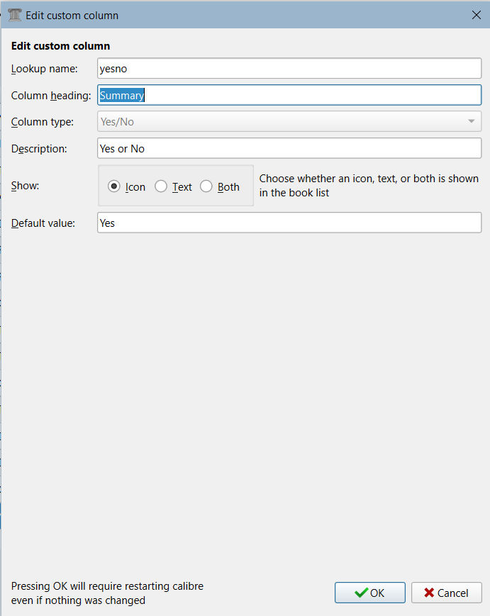 I just readjusted all of my Libraries after completely removing MicroSoft One Drive from my laptop. However, the custom column I had in my Calibre to show whether a book had a summary in the metadata isn't showing like it should. It used to show a green icon for having one or a red check if it didn't. Now, however, all I can get is a blank column.