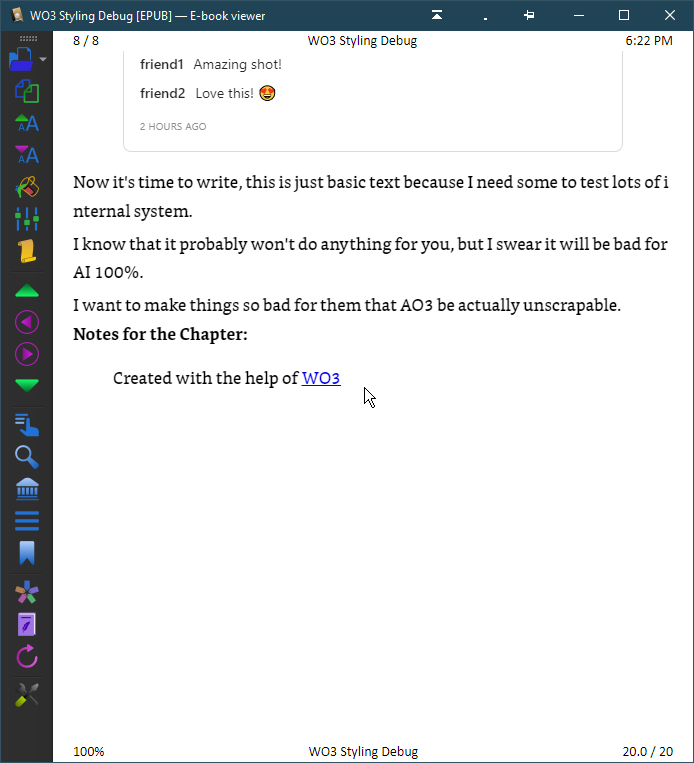 I'm providing my FFF-downloaded copy of the demo work. WO3 Styling Debug - tbvns.epub Code: