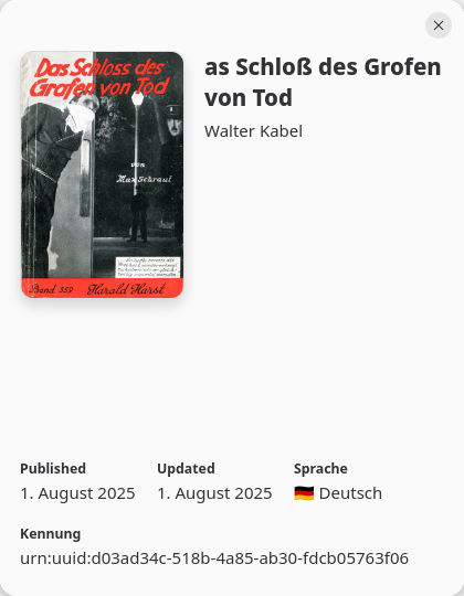 https://www.walther-kabel.de/node/35 Hier Harald Harst 352 >359-Das Schloß des Grafen von Tod< This work is assumed to be in the Life+70 public domain OR the copyright holder has given specific permission for distribution. Copyright laws differ throughout the world, and it may still be under copyright in some countries. Before downloading, please check your country's copyright laws. If the book is under copyright in your country, do not download or redistribute this work.