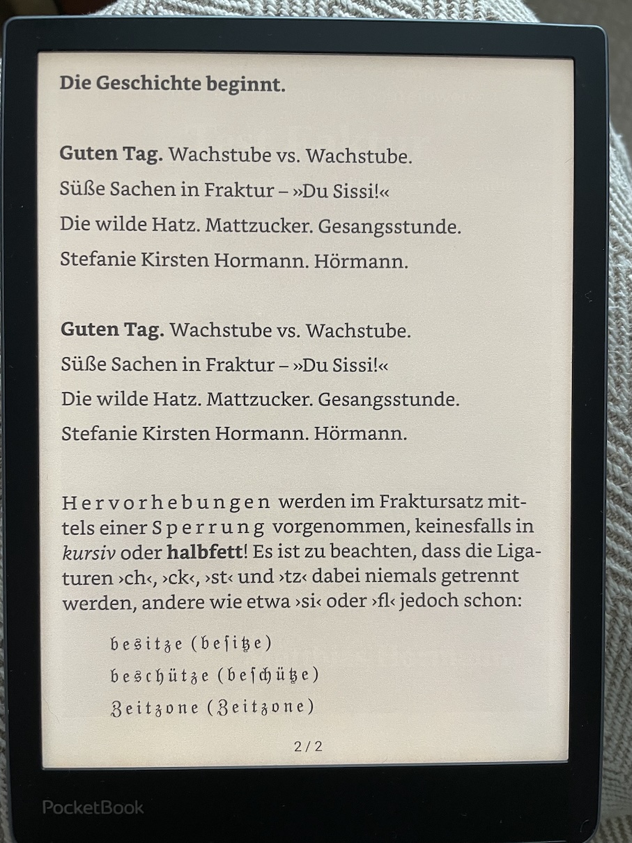 But if you look at the bottom of my first photo, you can see one of the custom fonts being used - the line starting "besitze". But in the CSS, that's using the same rule ("block_2" class) as the paragraph above it starting "Hervorhebungen" that is being rendered differently. What?! This is why I said it works "a bit". Editing the rules to add "!important" to the font-family doesn't seem to make a difference when I'm not using "default". I wonder if continually replacing the book via Calibre is confusing the PB? Maybe it has cached the old version. Quote:
