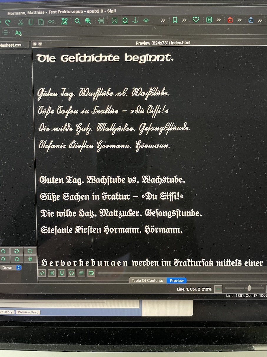 One question might be, if I installed a font in the usual system/fonts directory, can I refer to it in CSS, either with or without a @font-face? This would make the books completely non-portable, but would be a potential workaround. Separately, I noticed that <pre> does not render with a monospaced font. But <tt> does, which is a bit surprising. ![]() So "<pre><tt>...</tt></pre>" it is... |