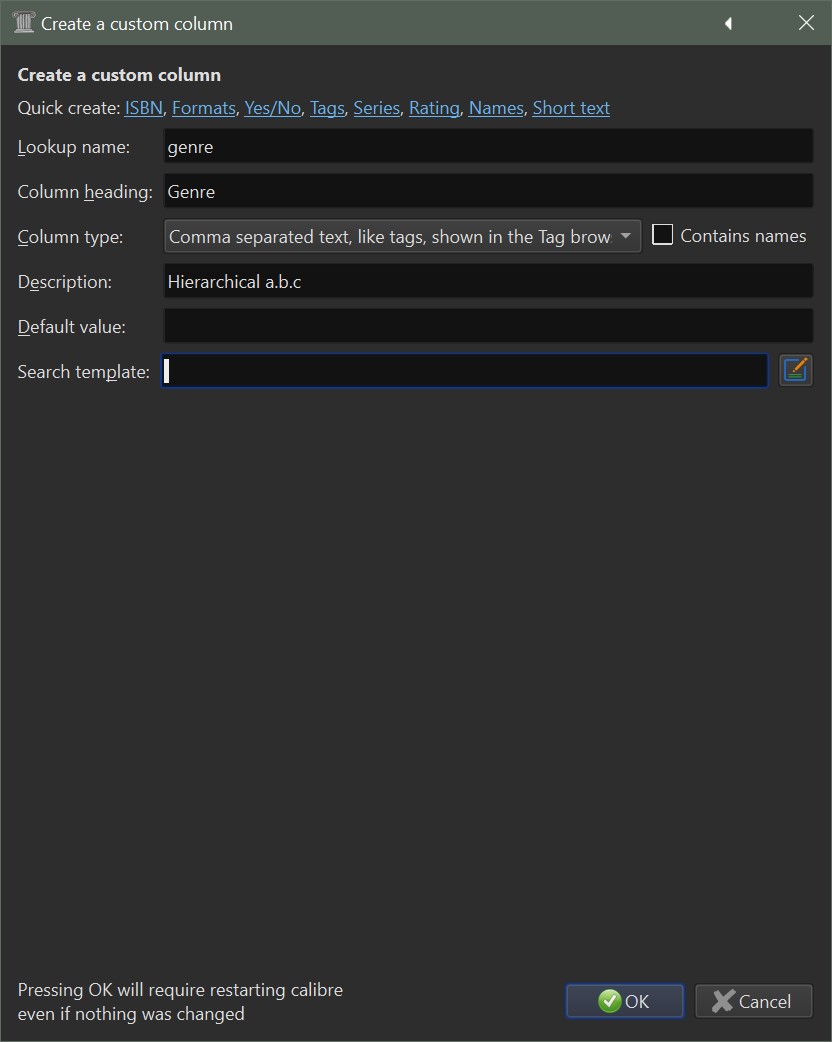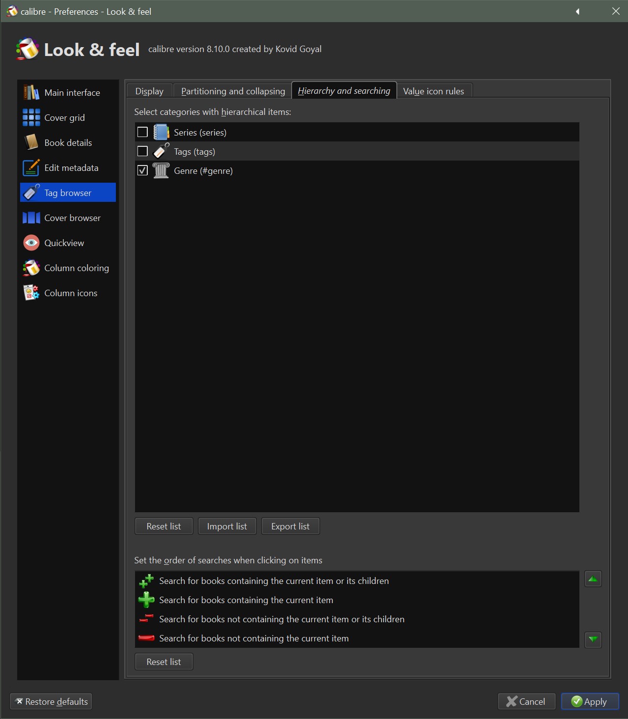 I am new to Calibre. I have tried to follow the instructions for creating a genre column with heirarchical entries, and i believe I have done everything correctly including setting the column as heirarchical and configuring Sort to By name. However, when I try to create a subgenre it simply creates a new genre. For example, for one book i want to create: