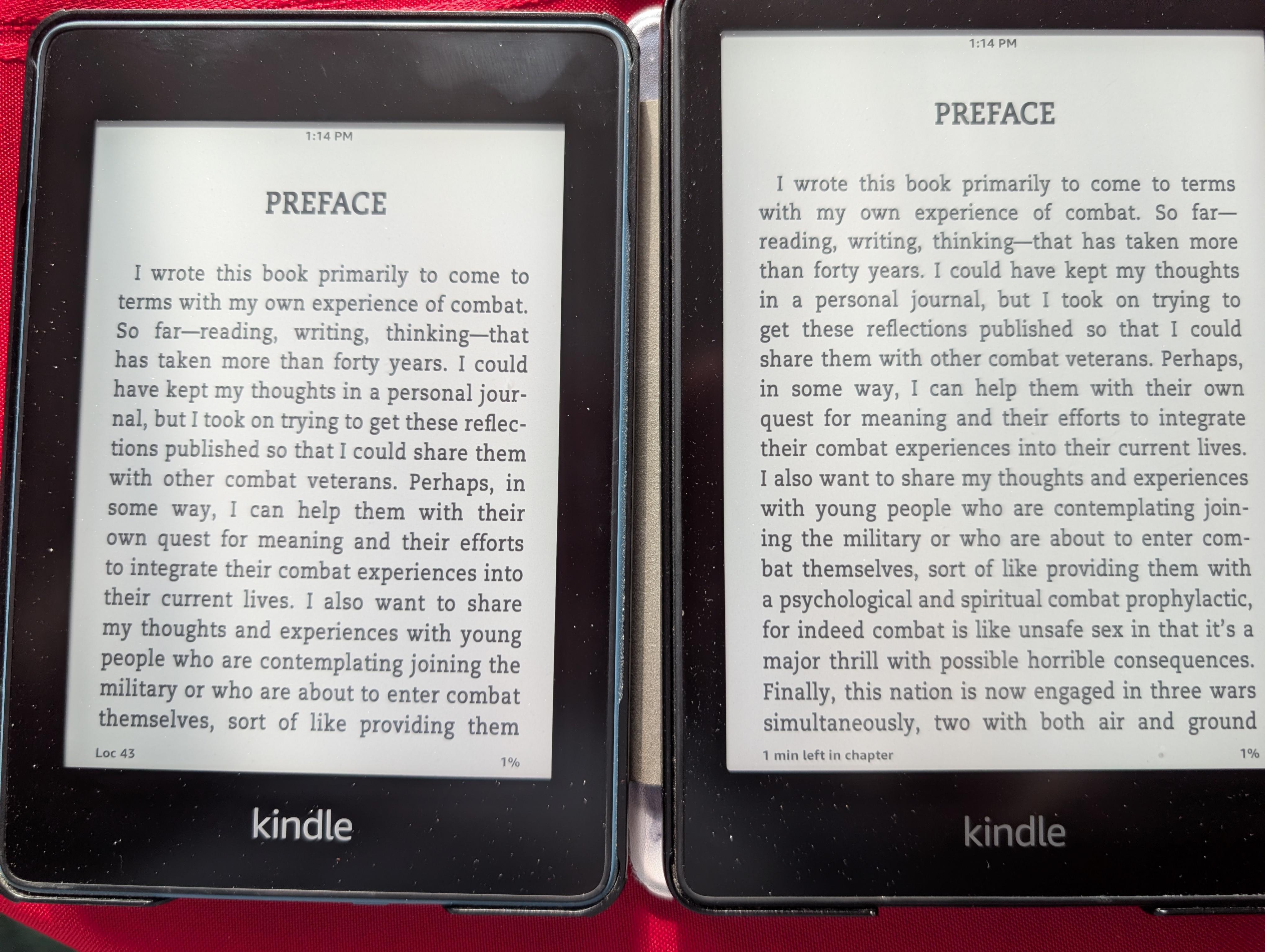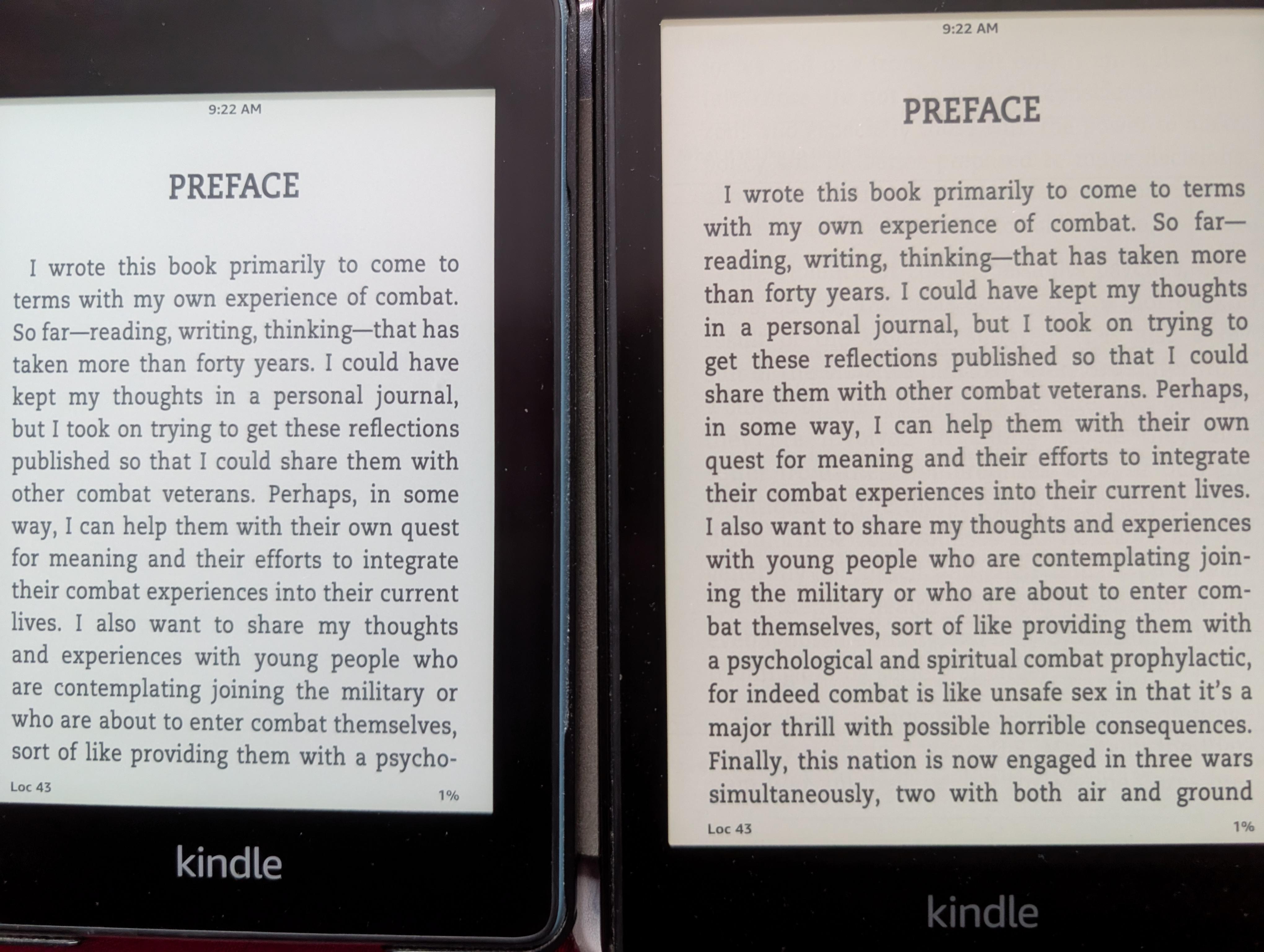 These seem a pretty accurate representation of what I see when I look at the screens; the clarity is the same with perhaps a slight edge to the device on the left, while the screen color on the right is creamier. The text on both is sharper in the flesh. I also took screenshots, but they don't seem to reflect what I see especially in regard to screen color and obviously it's harder to compare font clarity in a same-size image, but here they are FWIW. I thought they'd be a correction for poor picture taking skills and slightly degraded images. Screenshots: |