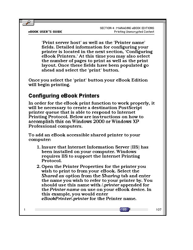 ![]() While the eBook Technologoies, Inc. website Guides don't have anything about this there Section 4: Managing eBook Editions, the ebook counterpart available to all REB1200 owners, as a free download after registering your REB1200, has the info you seek. In particular, on your REB1200, under the General Interest category, open eBook User's Guide Version 4.1 authored by eBook Technologoies, Inc. and turn to page 4. There you will note two new items added to Section 4: Managing eBook Editions, Transferring Personal Content to Your eBook and Printing Unencrypted Content. The latter has instructions to setup a Postscript capable printer with Windows using Internet Information Server (IIS) to make this work. Below I post images of the relevant sections as a quick reference. By the way, I could never get this to work, so if you get it working, please post here what works for you. AND THIS IS NOT AVAILABLE TO THE EBW1150. Last edited by nrapallo; 02-02-2009 at 11:03 PM. |