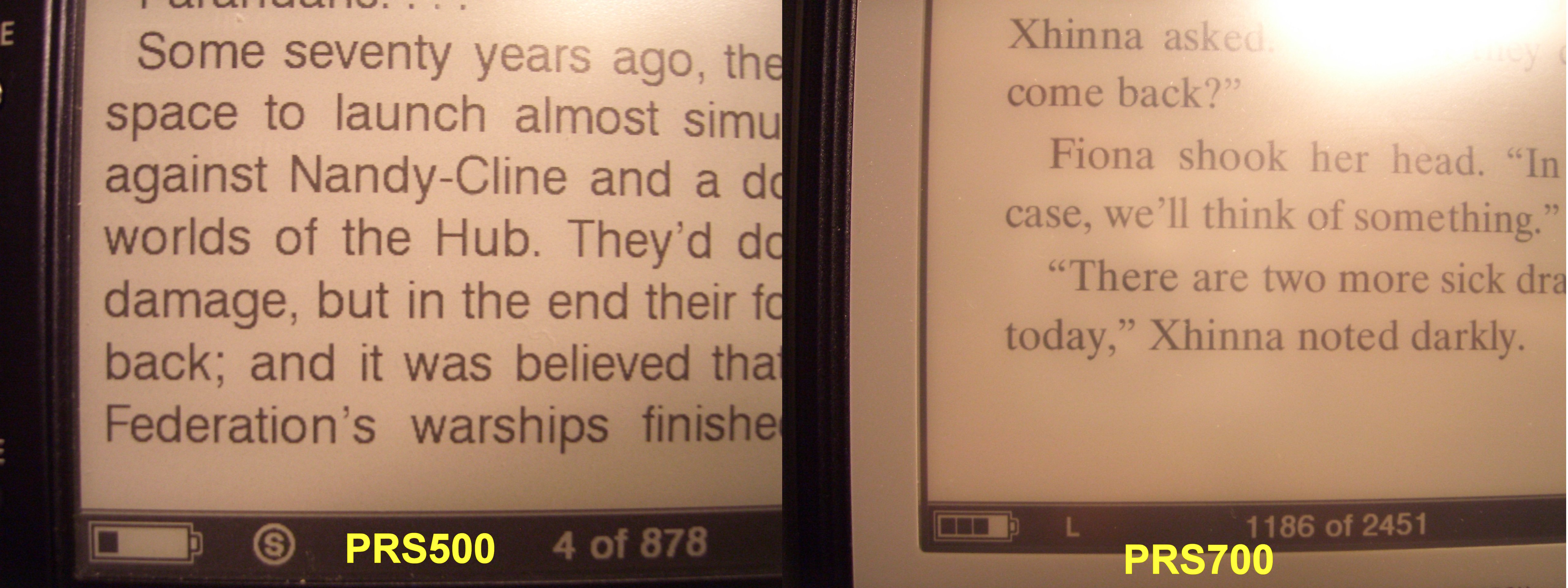 ![]() Two Weeks With The PRS700 Once again, the Sony Reader Marketing team has kindly, and generously allowed one of your MobileRead Editors the opportunity to examine and review their latest offering in the PRS line. From the PRS500, through the PRS505, and now the PRS700. Two weeks ago, when the review unit arrived, I transferred my current reading list over to it, and set aside my trusty PRS500. I figured that at this stage, when others have given the PRS700 a thorough treatment as far as specifications and basic operation go, the best "review" I can offer you is a hands-on "road test," so to speak, and the best way to do that was to commit to using the 700 for as much of that time as I could. Naturally, I will touch upon some hardware and software specific points, but within a context of how they affect the reading experience on the new device -- you already know the facts and figures, I'd like to try to convey what it's like to use a PRS700. Which means that the Reading experience is probably a good place to begin. In normal reading conditions, by that I mean without the front light turned on, I found the display on the 700 to actually have less contrast and clarity than that of the 500 (if it needs to be said: keep in mind that the 505's display is more contrasty and clear than the 500's). Just like all e-ink, the contrastiness and clarity improve with brighter lighting conditions. (I've attached some comparison pictures to illustrate the contrast and clarity differences. In taking the pictures I tried as much as possible to photograph both the 500 and the 700 in as close to exactly the same lighting, position, angle, distance and so on, as I could pull off -- I don't consider them identical, but they're pretty close.) My impression of the contrast differences is much the same as that of others who have commented on the lower clarity: it seems to result from a combination of the touch-screen membrane, and the plastic involved in the front light. Just like everything else in the world, there's a trade-off for those feature set increases, in this case, it's a decrease in "regular lighting" readability. For all that, I found that after a couple of days, I didn't notice it much any more, and the overall readability is still quite good. The other aspect (visually speaking) of the display that I'd like to remark on is that it is rather more prone to glare and reflections than the 500 or 505. It's the front light, again: in order to be read through, it has to be pretty transparent, which means more reflective. You can see in the third attached picture that there are some reflections on the display of the 700 that aren't there at all in the 500. Again, these were taken in more or less the same physical position beside a window, with the camera, photographer, and all lighting unmoved between them, and only a few tens of seconds time-space apart. The glare and reflectance are more noticeable on the 700 than the 500. What this means in practical terms is that the reader (the person, that is) spends a bit more effort finding an angle where the display is free enough of glare and reflections to read from. In the interest of full disclosure, and being as accurate and informative as possible, I should acknowledge that I am a person who's rather sensitive to glare, so that you can consider that factor as well. Something I'm not particularly bothered by, however, is fingerprints. Sure if they're really bad they bother me, but I'm not a fanatic about it. That being said, the touchscreen on the 700 does show some fingerprinting. This can mostly be seen when catching light on the display. I am in the habit of not handling electronics (especially other people's electronics) unless my hands are fairly clean, but I still see streaking and printing on the screen when I turn it to a light. Regarding the touch screen operation, and the display operation, since it's hard to really separate the two, I was most pleased. The response of the display refresh is very snappy, noticably faster than even a 505's refresh. The "swipe and hold" motion for rapidly skipping through pages is as fast as could be hoped, not quite too fast to follow with the naked eye. It's really surprising to see e-ink responding so quickly! I used this feature some for navigating Bible chapters, and it worked like a charm. The touch-screen selection of links greatly improved this operation as well, allowing me to reach a particular passage in a few seconds (as fast or faster than I could with paper) where it was a minute or longer operation on the 500. I can see this feature being useful for reference works such as a straight dictionary: links to the start (and maybe middle) of letters, and then skip through to find the page. Most pleasing. The regular page turning was interesting, if not quite as straightforward. I should comment here about the touchscreen itself. While it will respond to a fingertip, it really responds best to something small and hard, such as the included stylus (which I didn't find a need for, very much) or the tip of a fingernail (which I used a lot). What that means is that when using a fingertip, a firmer pressure was required, and a longer duration touch, to make the command register. Not much pressure, you understand, just more. I did find myself mostly using the hard-buttons to change pages when reading one-handed: when sitting up, the "swipe" worked great, but the buttons seemed to be more convenient for me when lying down, and certainly when doing something else with the other hand. The menu system is a marked improvement over the 500/505 menus, mostly thanks to the touchscreen control. Navigating between books was simple and straightforward, I even found myself accessing the settings menu to check the time (no in-book time display in the loaner unit, of course), it was so easy to navigate that I mostly did it without thinking about it, once it occurred to me that I could. Also related to general navigation, I 