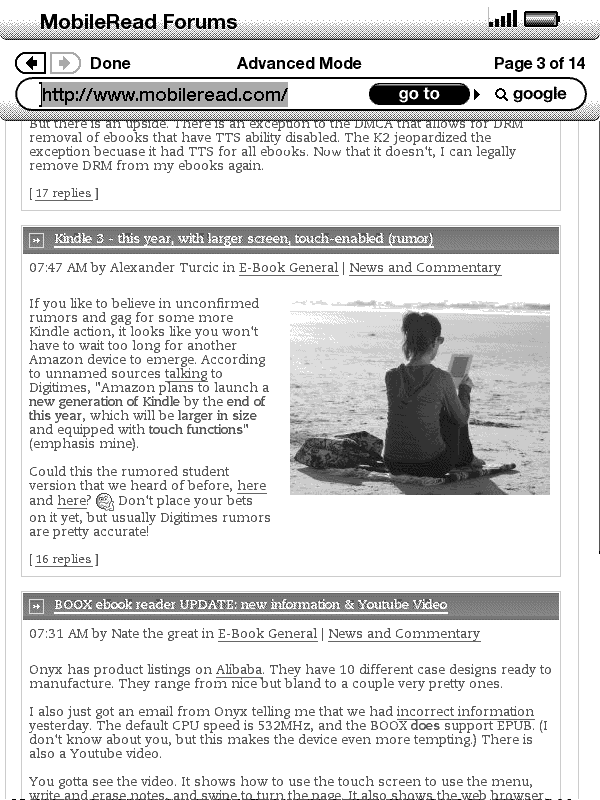 On Kindle 1, you must have an SD card installed to use this trick as the images will be saved as .gif files on the SD card. On Kindle 2, the .gif files are saved in the "documents" folder. I'm starting with images I grabbed while surfing MobileRead on the K2 browser, which, by the way seems significantly faster than K1 to me. I visited MR using the mobile version, then the regular site in both basic and advanced modes. Mobile and basic are pretty fast. Advanced slows things down and is more tedious but I was able to see images and avatars very well. In basic mode to see an image in a post, I had to click on an image tag which sent me to a page with just the image on it. I also noticed that with Mobile and Basic, the text was darker (darker still if you bump up the font size). In advanced mode the text was this medium gray and difficult to read. If I need to surf on K2, I'll stick with basic mode (probably over mobile versions of the sites). The images show which mode I was using at the top. |