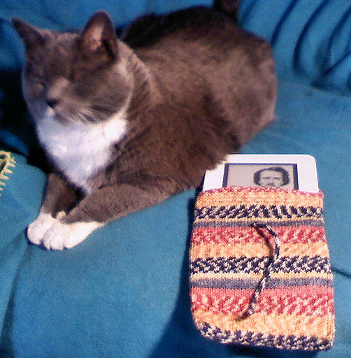 Knitted in the round on size 3, started with 80 stitches. Knit in stockinette stitch until 1 inch before desired length. Switched to garter stitch on the front and continued in stockinette stitch for another inch. Cast off garter stitch portion and continued in stockinette stitch to make a flap (first two and last two stitches done in garter stitch). Knit the last inch of the flap in garter stitch. Knit 2 I Cords for a closure. The model in the picture is my fat cat, Jeri. |