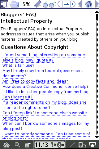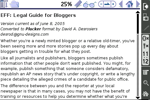 Thanks to a note from Alexander.. I've taken the EFF's Legal Guide for Bloggers and hand-transcoded it into Plucker and iSilo formats. This is not simply a conversion of their online version, lots of pages were added, split up and other usability elements were added (you can see this in the screenshots below). The physical content remains identical, it was just reorganized and restructured for PDA display on smaller screen devices. All of the internal links work, and external links are not included but are kept visible in the document (many link to pdfs and very large websites). This means you can cut-n-paste the "offsite" links and read them on your own, without having to have a monstrous document on your PDA. Please take the time to read this document in full and share it with everyone you know that cares about blogging and the legal implications of blogging. Please don't forget to Support the EFF and their efforts! They've done an outstanding job on many fronts (including defending us against several companies violating the license of Plucker). Enjoy everyone! |
