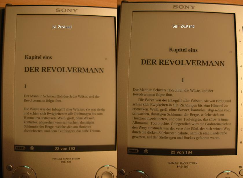 Habe bis jetzt 3 Bücher gekauft. Stephen King Schwarz, Drei & Tot. Bei Schwarz und Tot werden keinerlei Bilder angezeigt. Sind als SVG embedded. Soviel ich bis jetzt verstehe unterstützt weder ADE noch der Sony SVG-Bilder. Tot lässt sich gleich garnicht auf dem Reader lesen. FileSize eines Chapters größer 300kb. Dort gibt der Reader auf und zeigt keine einzige Buchseite an. Um die Dateien etwas mehr unter die lupe zu nehmen gibts ja tools. Weder css-files noch die header der html files sind valid laut tidy. Ich habe mal einen Screenshot vom Ist und Soll-Zustand angehängt. Das momentane fehlen des Blocksatzes lässt sich ja noch verkneifen. Aber was ich nicht verstehen kann ... wozu man um die schrift noch 1cm breiten Rand haben muß. Ich nutze schließlich auch nicht nur die Hälfte meines Monitors. |