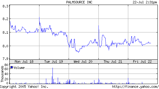 Small update: Yesterday PalmSource stock slipped further to $7.54, a new all-time low.
