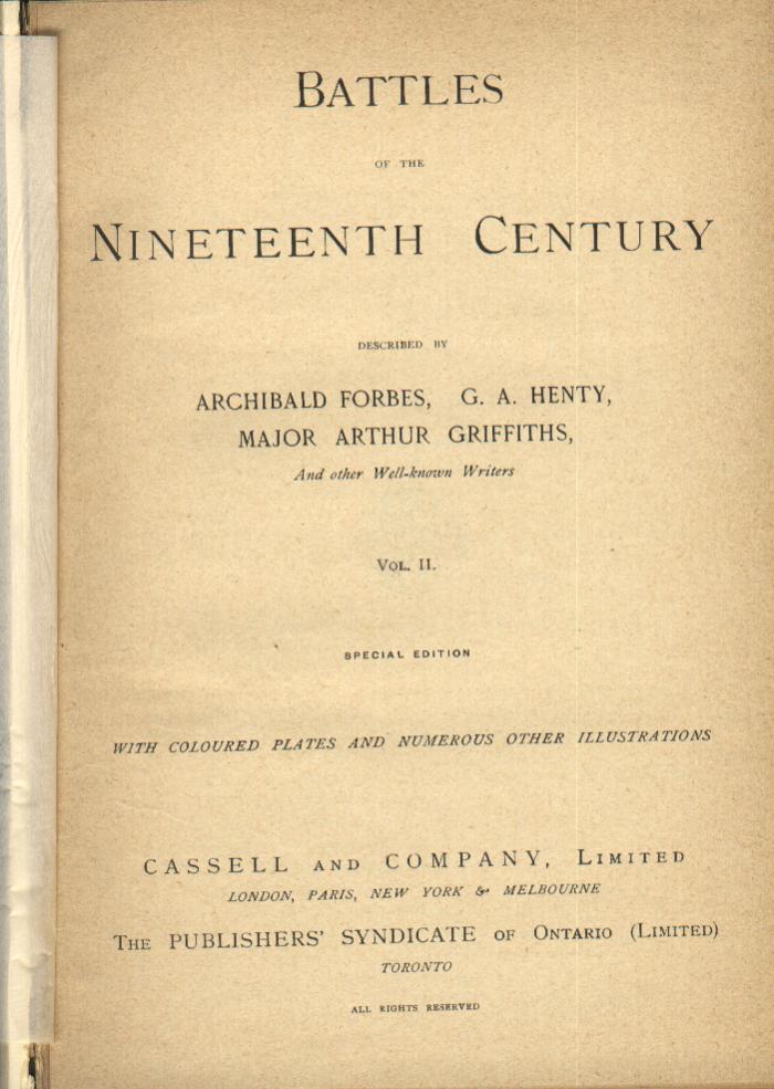 I own volumes 2, 3, 4 and 5 of "Famous battles nineteenth century" by Forbes, Henty, Griffiths et al. These books are old, they look antique. Binding, typesetting and illustrations are exquisite.