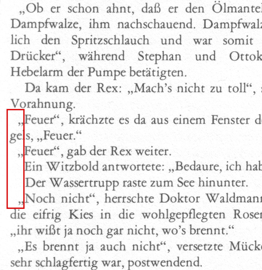 Ich würde gerne mal eure Meinung zu folgendem hören: Bei älteren Büchern ist mir aufgefallen, daß der Einzug zum Teil unterschiedlich groß ist, je nachdem ob Anführungszeichen dabei sind, oder nicht. Also der erste Buchstabe bei nem neuen Absatz kommt immer an der gleichen Stelle, aber wenn Anführungszeichen dabei sind, dann stehen die weiter links als normal. Ich hab mal ein Beispiel von nem Buch beigefügt, ich hoffe ihr versteht was ich meine. Bei vielen aktuellen Büchern ist das nicht mehr so, da ist der Texteinzug immer gleich, egal ob er mit nem Buchstaben oder nem Anführungszeichen anfängt. So was kann man ja problemlos selbst machen. Ich hab einfach überall, wo ein neuer Absatz mit einem Anführungszeichen anfing, einen neuen CSS Style eingefügt, sieht auch genauso aus, wie bei dem Beispiel. Meine Frage ist: wie gefällt euch so was? Gerne auch mit Begründung. Danke im vorraus Last edited by NASCARaddicted; 11-07-2010 at 04:15 PM. |