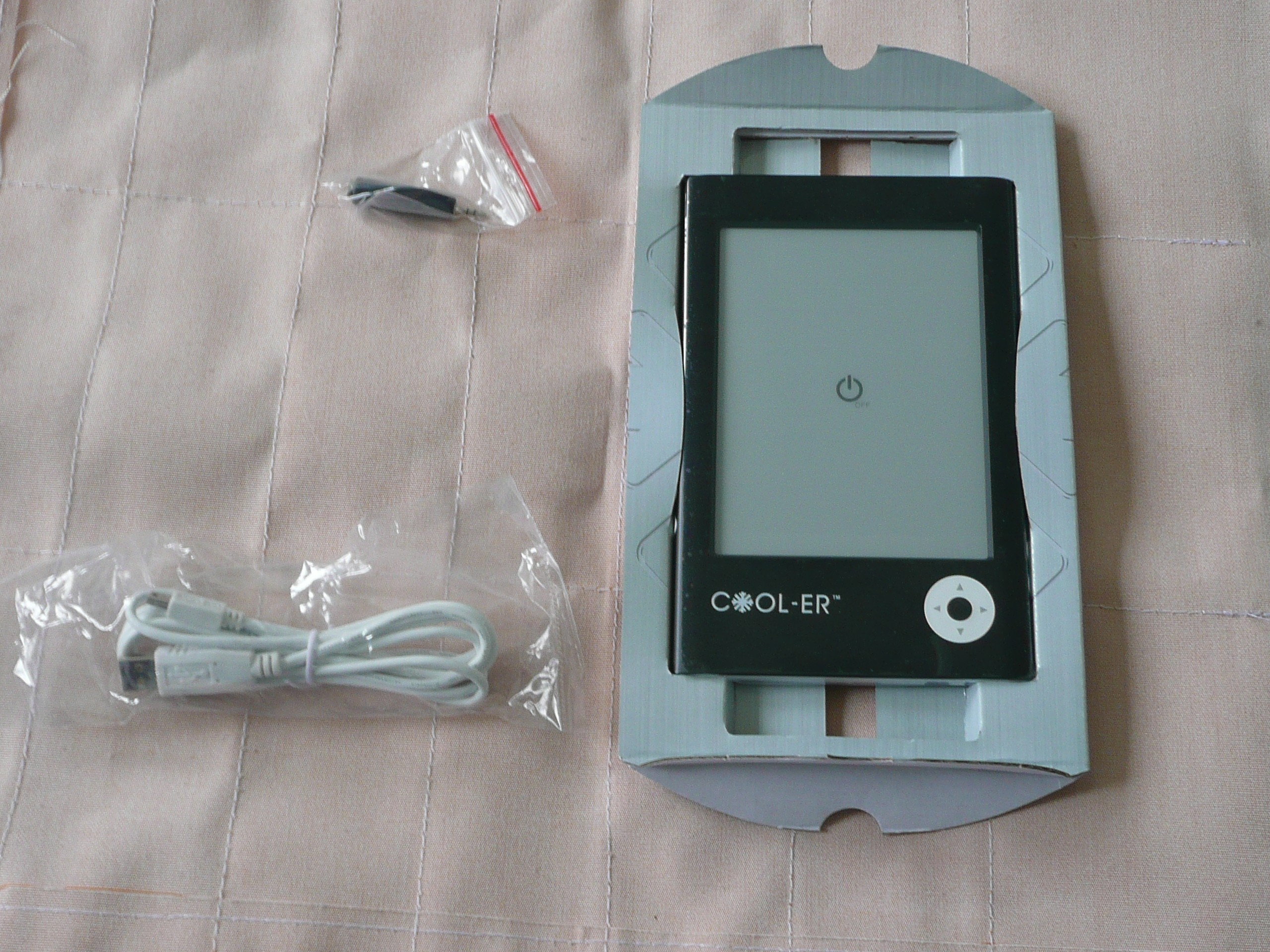 Cooler wurde von DHL geliefert. Er war sehr gut in einem Jiffy- Pack verpackt. Die eigentliche Verpackung ist ein recht stabiler Pappkarton. Das Zubehör ist mit einem kleinen Beipackzettel, einem Kopfhöreradapter und einem USB-Kabel eher minimalistisch. Das Lesegerät selbst war noch einmal zusätzlich mit einem Klebeplastik geschützt.