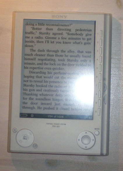 Waterstone's been having a 505 cover sale, and since I've been thinking of getting a 600 - and in that case might relegate the 505 to 'kitchen duty' for recipes - I thought a silicone cover might be a good investment. I just got today, and somewhat to my surprise, it's a very nice cover overall - it really doesn't look as nice on photos as it feels to hold. It has a nice feel, and gives the Reader a good grip. It's "white-transparent" rather than white, and this is the interesting part, since, while you can still see the buttons through the skin, it blurs all contrasts on the Reader - button edges, printed text, edges in general - and the text on the screen looks especially crisp and clear in comparison with this. I can follow the idea that a dark-coloured edge might give a greater, perceived, contrast, but I hadn't imagined the silicone cover would do as well, in its own way. |