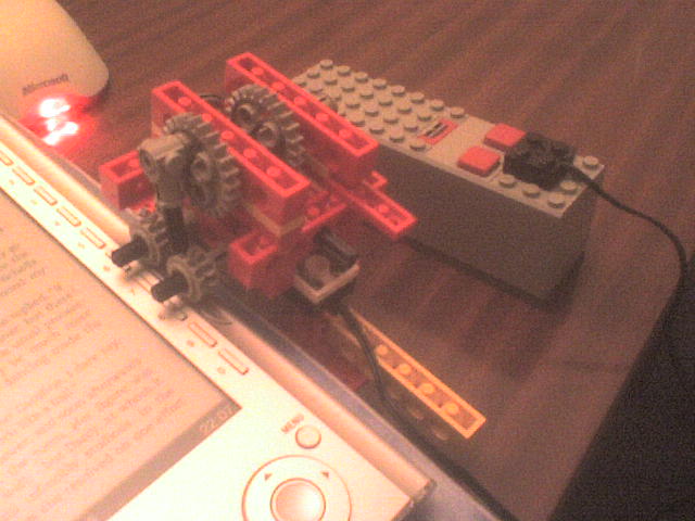 Hi all, I put this together last night. Its good for skimming books, and avoiding arm fatiuge. The key component is the worm gear, which slows the action down and increases torque. The cord is about 1 meter long. The page turn rate is about 1.5 seconds at the moment. It's made from lego (technic) sold around 1995. Sets with similar components are available so you could make your own if you want. It should be possible to make it nearly silent; this would be an improvement as you can tell from the video! Here's hoping the members over at the developers thread can get the automatic page turn going in software, so this is unnecessary. === Version 2 will make the second button on the remote press the page backward button (at the moment they both go forward). Last edited by gregcd; 09-09-2009 at 01:10 AM. |