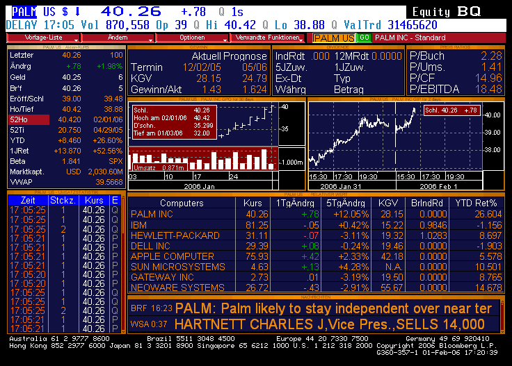 Palm saw a remarkable surge in their stock price over the past few weeks (they just hit the $40 mark, a new 52-week high), and it's not only the introduction of the Palm Treo 700w that has been feeding investor fantasies. Attached you find some graphs depicting Palm stock performance as of today, 01/01/06, 06/01/05, and 01/01/01.The following Briefing.com news went through my mails today: Palm likely to stay independent over near term Caris notes that PALM's torrid rise over the past few weeks could be partly attributable to take-out speculation; however, they believe it is likely PALM's mgmt will remain independent, at least over the near term. The firm says the co is broadening its portfolio, diversifying into new customer segments, and ramping its international sales. The firm says that several large-cap computer and wireless cos, like HPQ, MOT, NOK or DELL, could be natural buyers and have ample capital, business synergies and interest in boosting their rev growth rate to merit due diligence on Palm. Caris & Company analyst Susan Kalla has initiated a "buy" on Palm in September 2005 and she envisions, thanks to the Treo 700w, better than expected revenues and margins for Palm for the next few quarters. Given that Palm is currently trading at a low PE and that smartphones are becoming more popular every day, it's not unlikely that various large cap companies have a general interest in Palm. The question is, what would happen to our beloved Palm handheld if it was indeed acquired by a big name such as Apple (who btw recently filed the "Mobile Me" trademark)? Related: Sprint Treo 700w expected to arrive earlier |