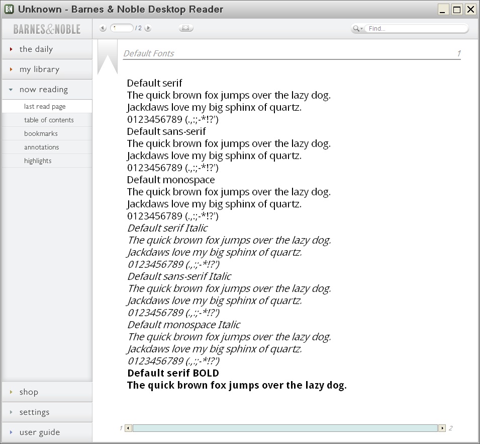 And the epub books I loaded had all sorts of weird characters displayed, which display normally in ADE. It seems the B&N's reading system has even worse default Unicode character coverage than ADE, and I didn't think that was even possible. It also made it evident they rolled their own (crappy) engine. The justification and font selection is pretty nice though. Hopefully other Reading Systems will pick up on it soon, it's pretty damn basic yet completely absent from every other commercial renderer.  |
