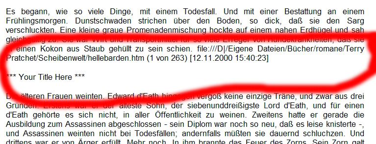 Since some days I've got my iRex iLiad, but I'm trying already since some weeks to convert different ebooks and I was reading already in this forum a lot of the topics. But I found nothing about the problem that occurs with some of my ebooks. I'm converting all of my PDF books to mobipocket because IMHO its the best format on the iLiad. With most of the books everything was alright, I could manage it to convert them without any problems to mobi format. But with some of this books I noticed a strange problem: More or less on every page there's suddenly a text "file:///D" including the whole path and "**Your Title here***" - see attached pic. In the PDF file there's nothing like this, I set the Author and so on in the PDF and in Calibre, so normally there should be nothing like this. I read in this forum that very often strange things happening during the PDF conversion, is it possible that these are tags from the PDF file which I can not delete? |