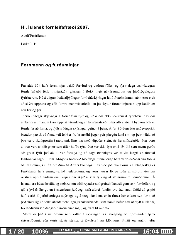 I'm currently learning Archeology and lots of the text is only available in .pdf or word files. I was wondering if it can support reading those files and if it can display Icelandic text (Some of the material is in English so this is not a "must" but really preferred). Also if somebody has the device and doesn't mind testing for me if the Hanvon N516 5" can read Icelandic text. Here the file: http://www.megaupload.com/?d=9JOX132U 275.47 KB First chapter in Icelandic Archeology (in .pdf). The first lines should say this. Fornmenn og furðuminjar Frá alda öðli hafa fornminjar vakið forvitni og undrun fólks, og fyrir daga vísindalegrar fornleifafræði féllu minjastaðir gjarnan í flokk með náttúruundrum og þjóðsögulegum fyrirbærum. Nú á dögum hafa alþýðlegar fornleifaskýringar látið fræðimönnum að mestu eftir að skýra uppruna og eðli fornra mannvistarleifa, en þó skýtur furðuminjatrúin upp kollinum enn hér og þar. Sérkennilegar .... Also I would like suggestions for other devices that could meet my needs (preferable not to expensive and worldwide shipping). |