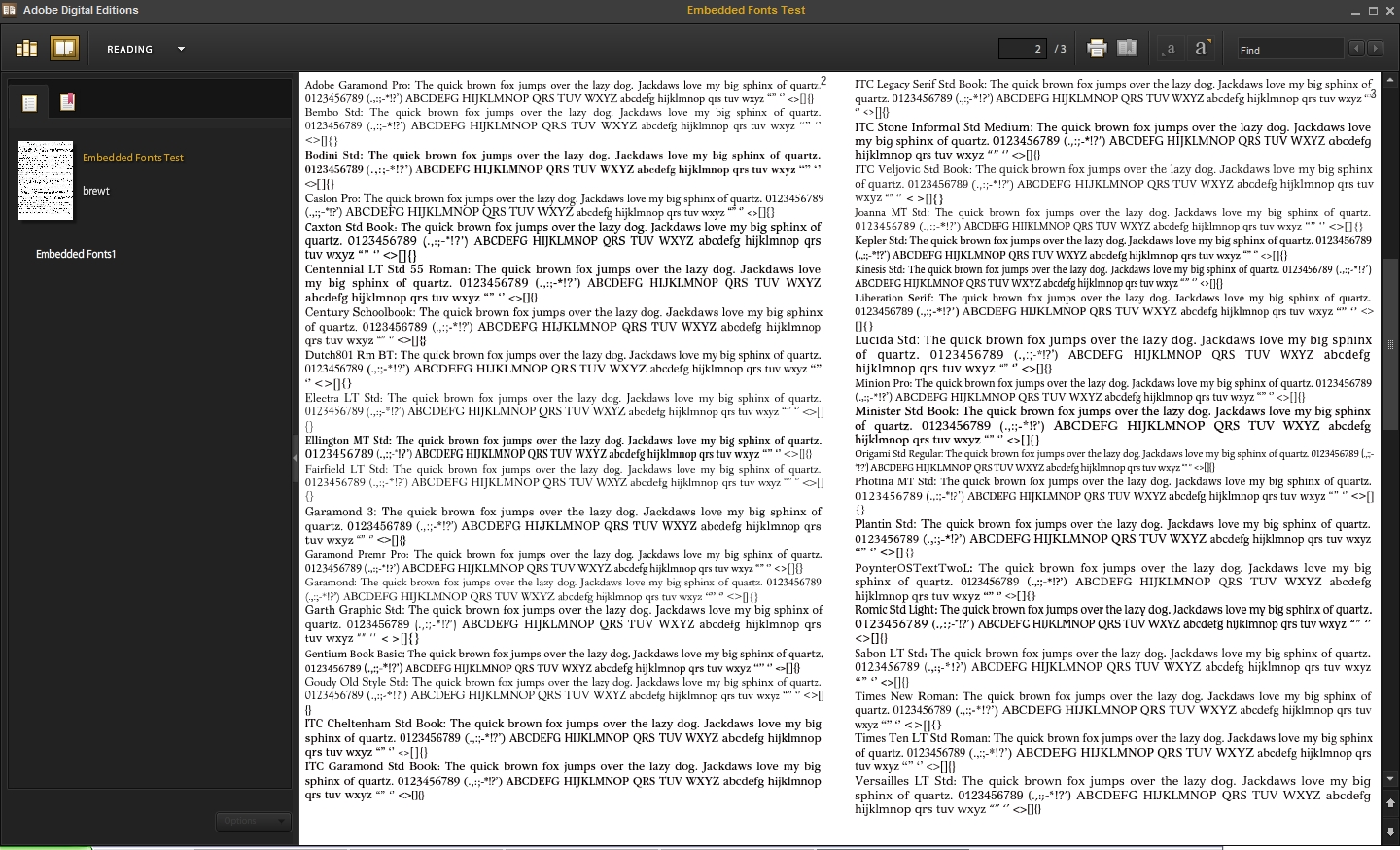Attached is Take 2 of the embedded font test. More serif fonts included (39 now). Created in Word and Indesign CS4, fonts encrypted via Adobe encryption scheme. Reprocessed to add meta data in Calibre. If you see one you like, please go out an BUY IT. Don't Swipe It. Embedded fonts show up in ADE,Sony Desktop Reader, Sony Reader, Calibre. Embedded fonts do not show up in Firefox, Barnes & Noble Desktop. File would not open in Stanza PC, Opera. Anybody got something else to try it on? -bjc Last edited by brewt; 03-01-2010 at 09:24 PM. |