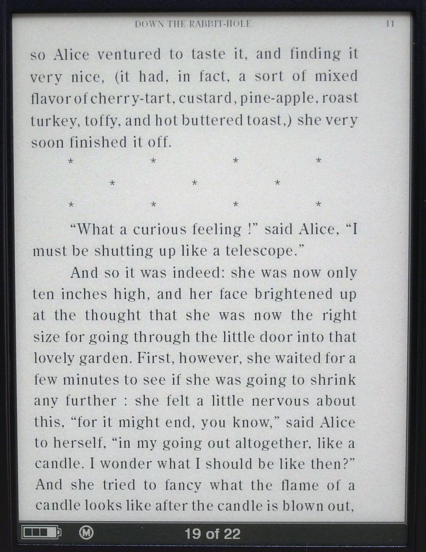 I've attached a sample pdf created from a public domain book. If someone could possibly try loading it onto their reader to see how it reads I would appreciate it. Some photos of the content being displayed would be wonderful. This pdf was created page by page from the source material using InDesign. It's a time consuming process but as far as I can tell the only way to have total control over the layout. I'm particulary interested in seing how the reader displays the embedded images. I've tried to stay true to the source material layout (http://www.archive.org/details/alice...wond00carrrich). I want to start putting together some content while my reader is on order so any comments on the font readability, size, contrast, etc would be nice. Thanks, Rob |