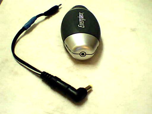 This emergency charger is based on Energizer's Energi-To-Go (ETG) cellphone charger. It runs on 2 AA Lithium batteries, is small and lightweight and will fully charge a 505 reader and just about any other reader that uses a 5VDC adapter. One set of AA Lithium batteries should fully recharge a 505 reader several times. The mod is simple, but will require some electronics skills. In short: take one of the ETG cables, cut off the cell phone plug and replace it with a Sony reader plug (or Sony PSP plug - same thing). That's it. My Sony reader/PSP plug came from an old universal battery (seen as a big black disk in the pictures) that I don't use anymore. The battery cord had a receptable that accepted a set of interchangeable plugs. Any electrical cord with a Sony reader/PSP plug on it can be scavaged for this project. Parts: 1 Energi-To-Go charger pod 1 Energi-To-Go charger cable (for any model cell phone) 1 cable terminated with a PSP power plug misc: soldering iron, solder, ohmmeter or continuity tester The ETG chargers may or may not be discontinued products. I see them being sold online and in stores heavily discounted. The original retail price was $30. I purchased two ETGs for Motorola phones from an Office Depot store for $1 each on closeout. Office Depot's website is still selling them for about $14. Buy.com's marketplace has some for $2 (but the seller is charging almost $8 for shipping). At one time, Target had these on closeout for about $5. As far as I can tell, the charger pods are the same for all cell phone models they support. Only the cables are different. They output 5-6VDC, which will initiate the charge cycle in the 505 reader. If you're not sure, measure the voltage output of the ETG with a voltmeter. It should fluctuate between 5 and 6 volts. While the reader draws power from the ETG pod, a blue light on the pod flashes. When charging is finished, the blue light turns off. Instructions: 1. Each ETG cable has a plug on one end that fits into the ETC and a plug on the end for the cell phone. Cut off the cell phone plug, leaving as much cable attached to the ETC plug as possible. 2. Using a craft knife, cut off about 3/8 inch of the outer rubber jacket to expose two wires: red and black. The red wire is connected to the tip of the ETG plug and carries positive voltage. The black wire is connected to the body of the ETG plug and carries negative voltage. 3. Strip off about 1/8 inch of the insulation from the red and black wires to expose the copper. 4. Trim the PSP cable to about 4 or 5 inches (or whatever length desired). 5. Expose the copper of the positive and negative voltage wires in the PSP cable. An ohmmeter or continuity tester can tell which wire is positive and negative. The PSP plug is a barrel-type connector. The positive wire will be connected to the metal tube inside the barrel. The negative is connected to the metal tube on the outside of the barrel. 6. Solder the positive wires of the ETG and PSP cables together. 7. Solder the negative wires of the ETG and PSP cables together. 8. Insulate the connections so they don't touch and short out. I used heat-shrink tubing. Electrical tape will do. Although it tends to unravel, it can be secured with regular sticky tape. |